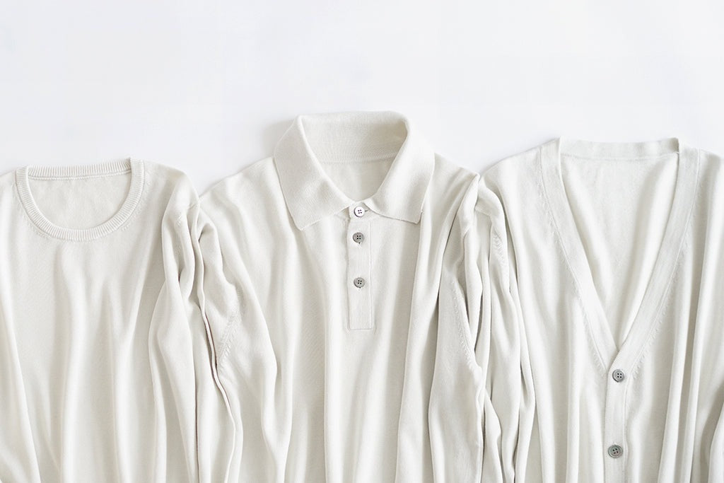 シルクでありながら、デイリーに着ても安心の特長を持つUTOのシルクニット。手洗いを30回繰り返しても、白化や風合いの変化が少ない特別な「ウォッシャブル加工」が施されています。